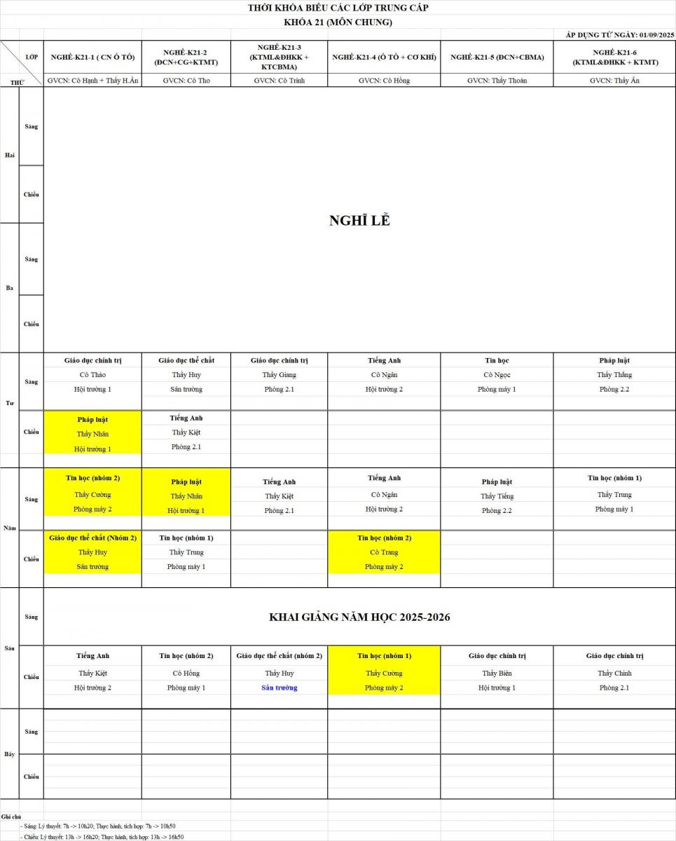 Thời khóa biểu K21 Từ 01/09/2025 đến 05/09/2025