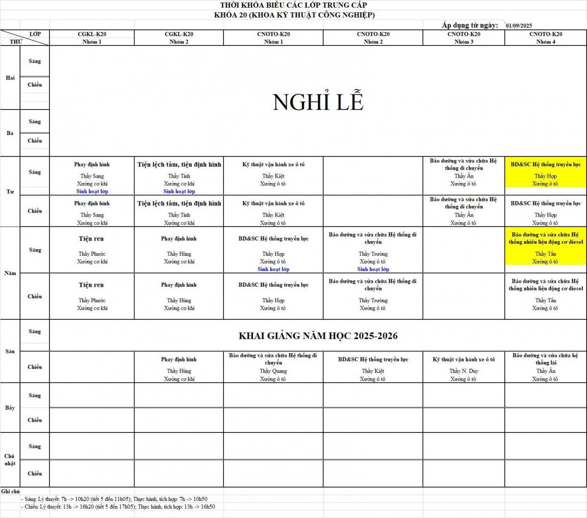 Thời khóa biểu Từ 01/09/2025 đến 06/09/2025