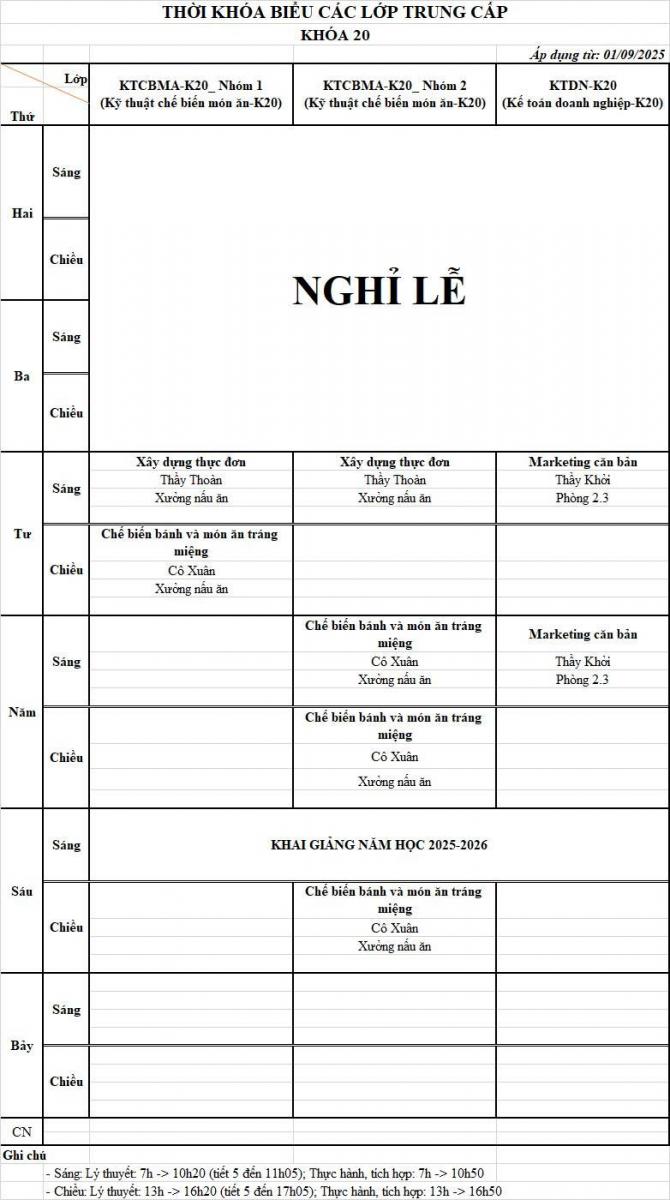 Thời khóa biểu Từ 01/09/2025 đến 06/09/2025
