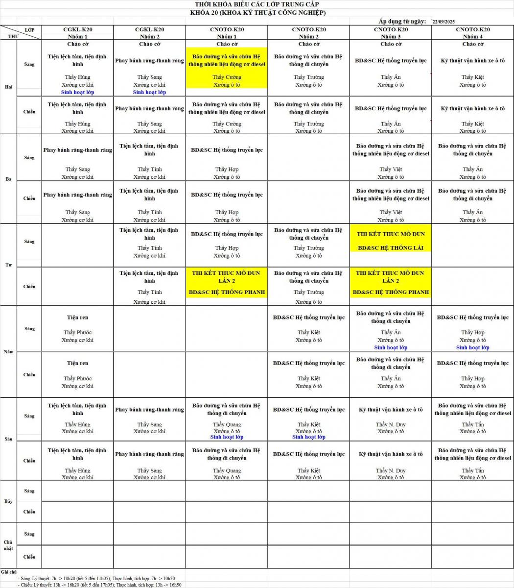 Thời khóa biểu Từ 22/09/2025 đến 27/09/2025