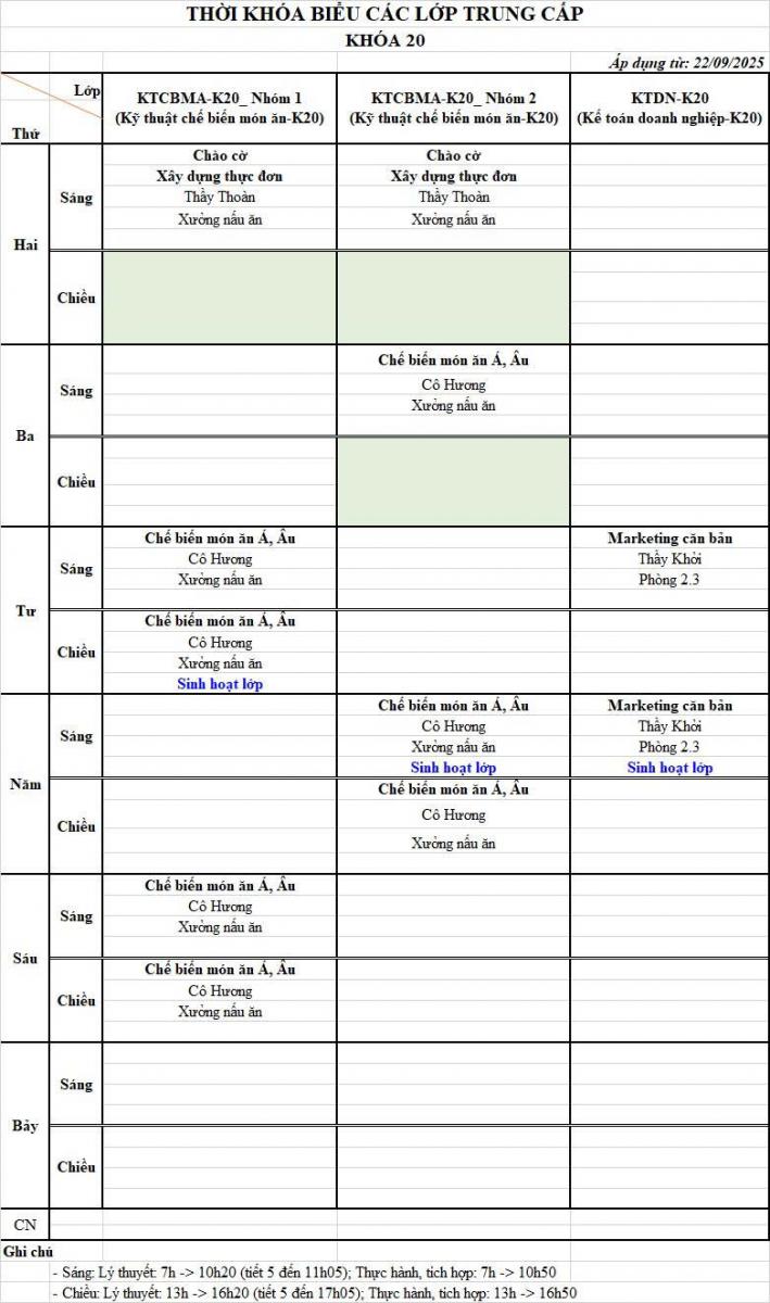 Thời khóa biểu Từ 22/09/2025 đến 27/09/2025