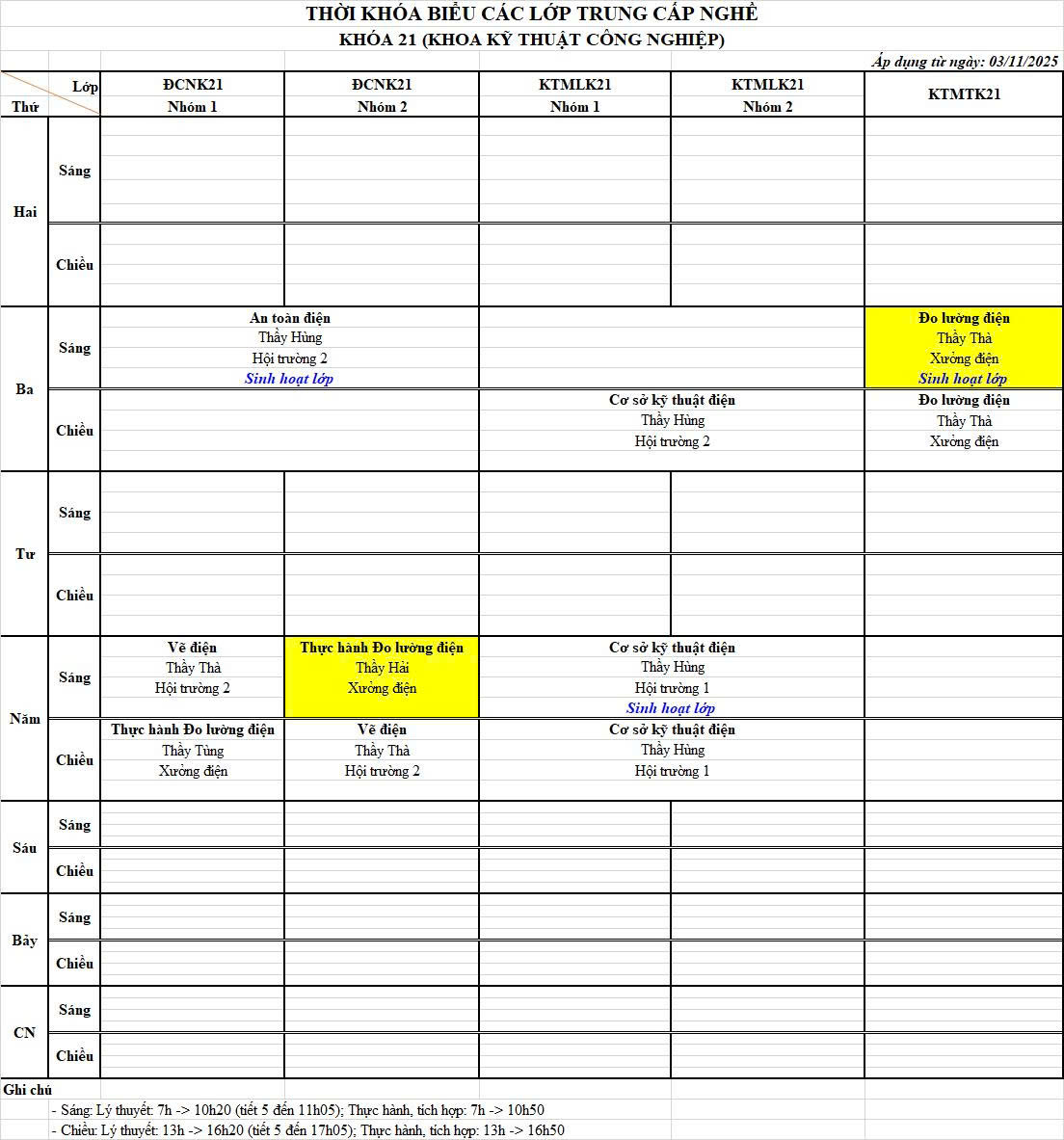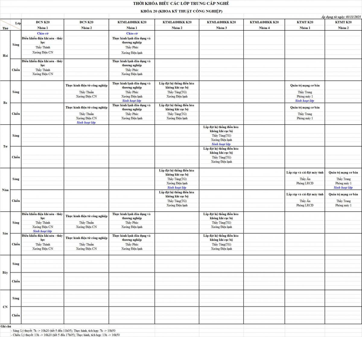 Thời khóa biểu từ ngày 03/11/2025 đến ngày 07/11/2025