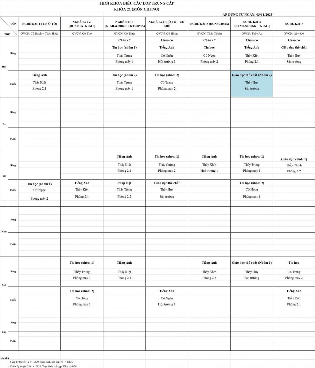 Thời khóa biểu từ ngày 03/11/2025 đến ngày 07/11/2025