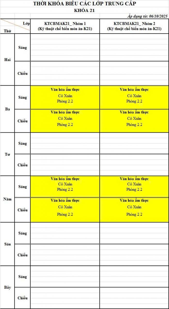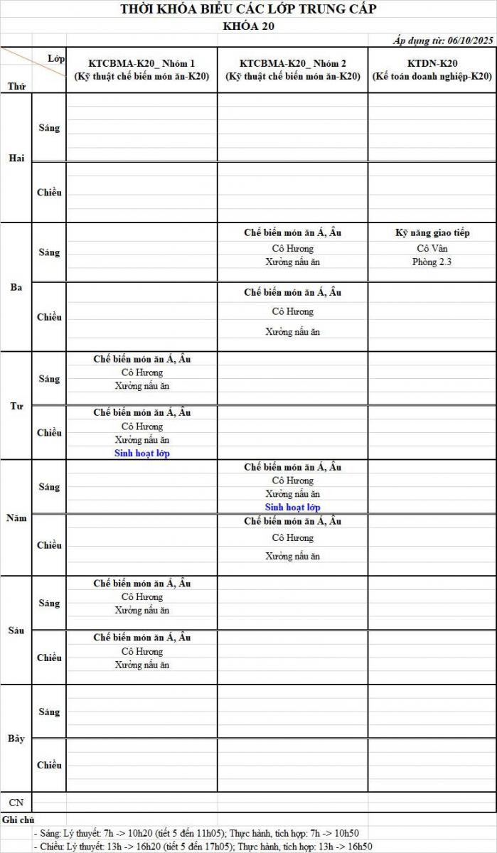 Thời khóa biểu từ ngày 06/10/2025 đến ngày 10/10/2025