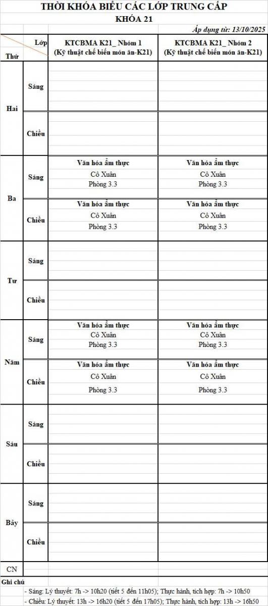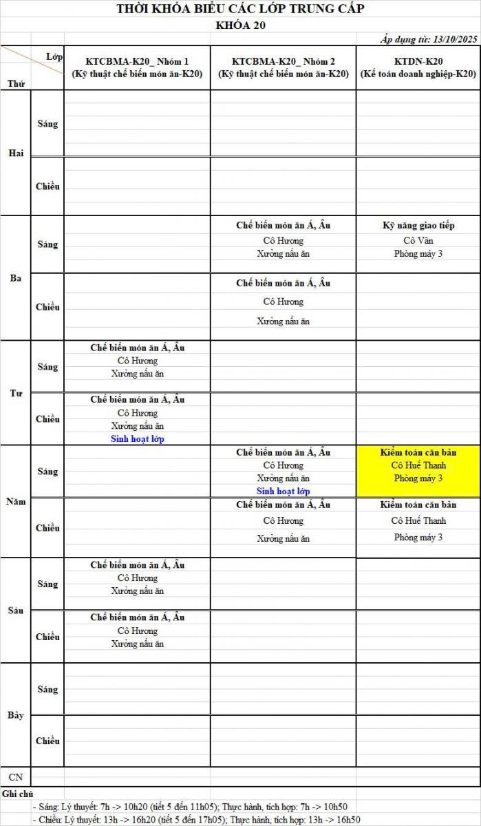 Thời khóa biểu từ ngày 13/10/2025 đến ngày 17/10/2025