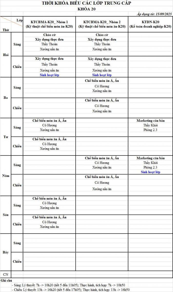 Thời khóa biểu Từ ngày 15/09/2025 đến ngày 20/09/2025