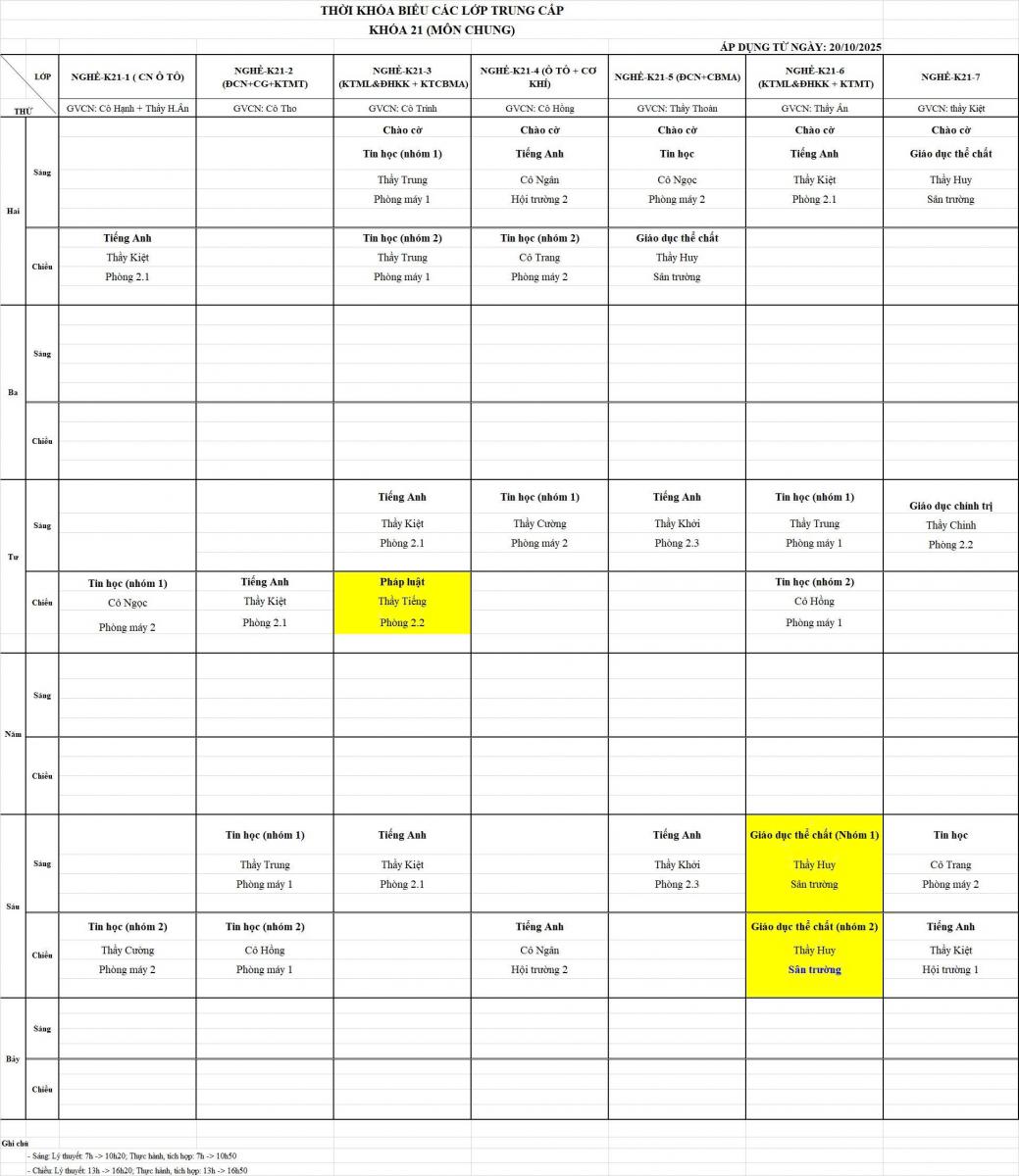 Thời khóa biểu từ ngày 20/10/2025 đến ngày 24/10/2025