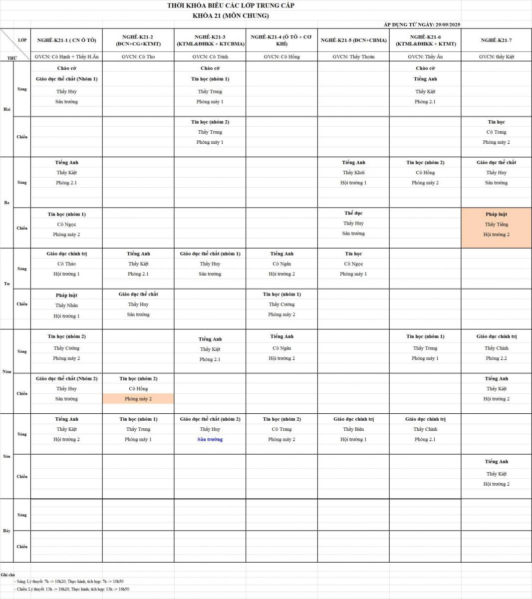 Thời khóa biểu Từ ngày 29/09/2025 đến ngày 03/10/2025