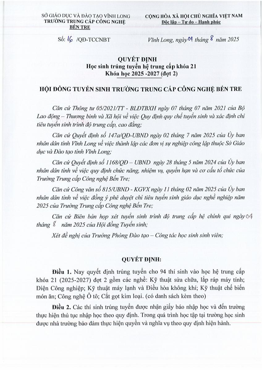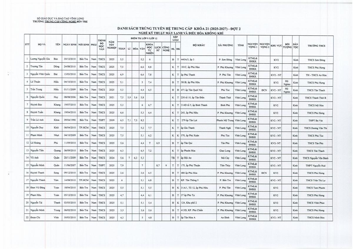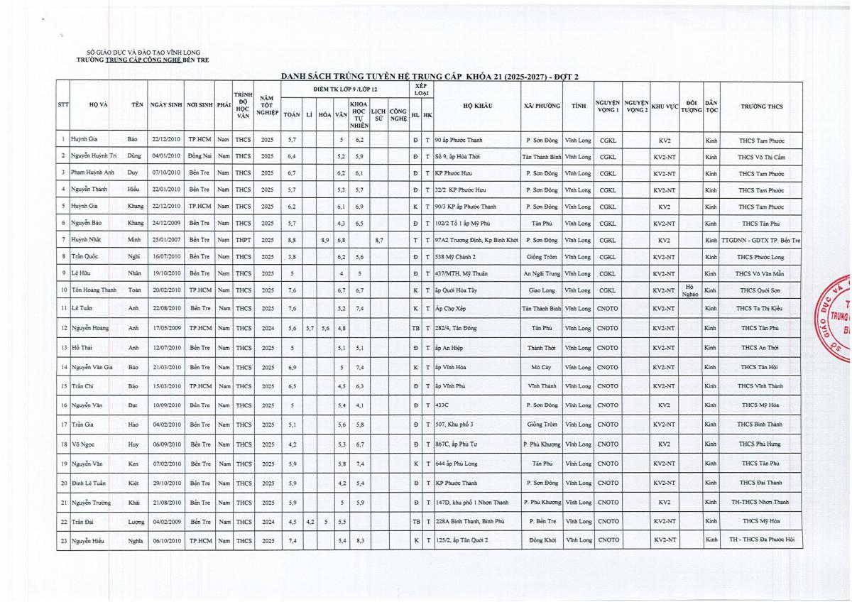 Thông báo trúng tuyển đợt 2 niên khóa 2025-2027